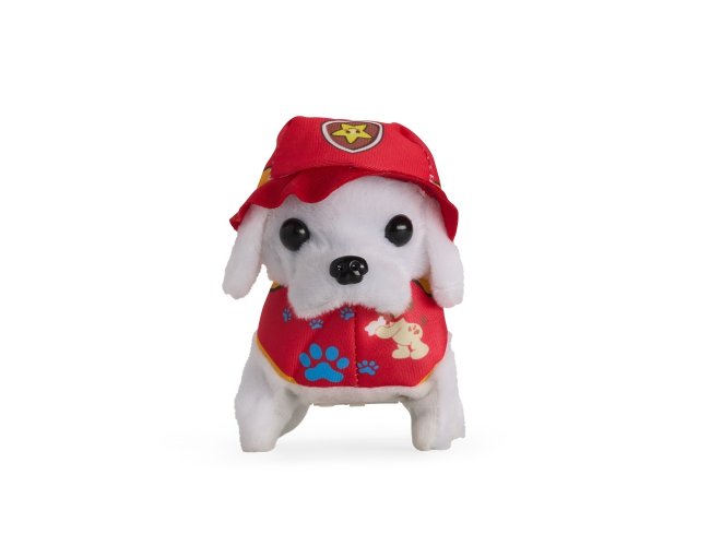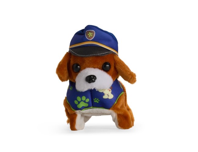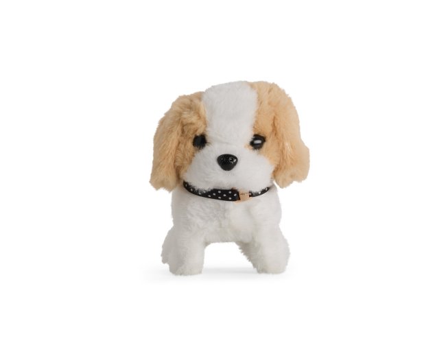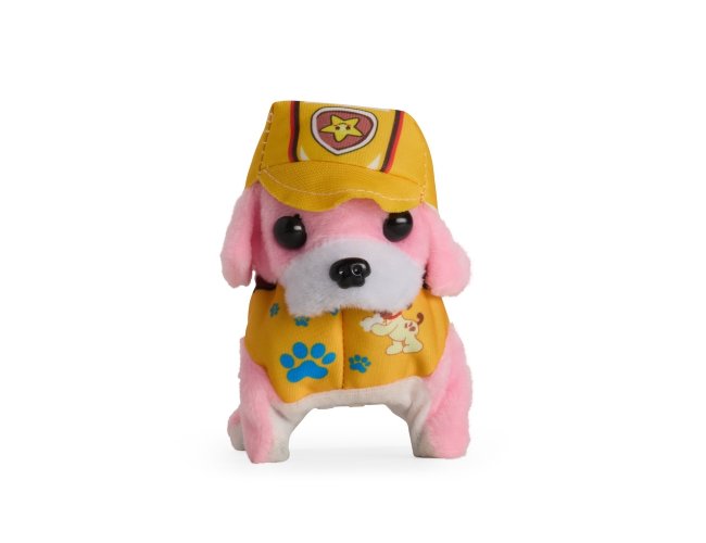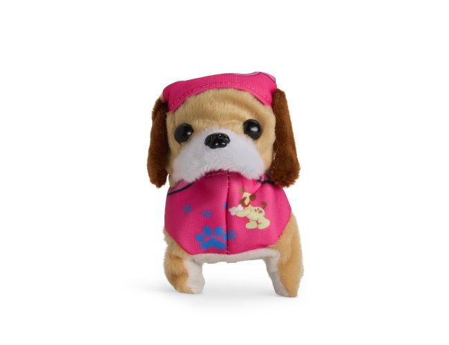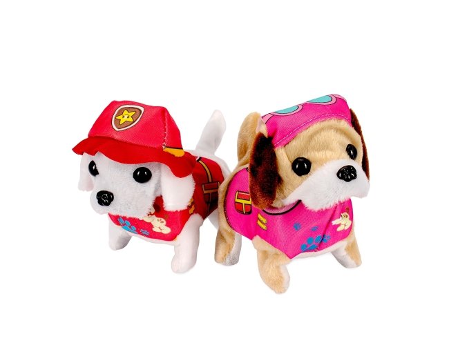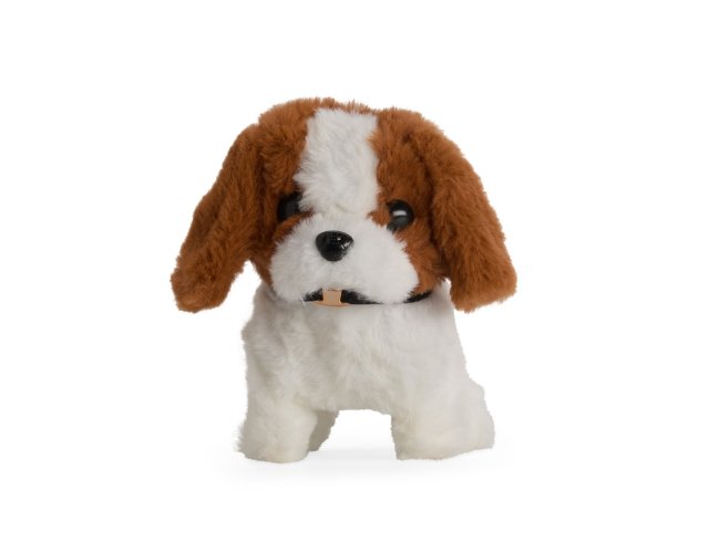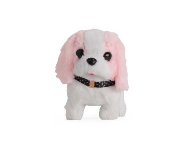 Brinquedo de pelúcia em forma de cachorro com elementos decorativos. Possui funções interativas de movimento e som alimentadas por duas pilhas AA (não inclusas).