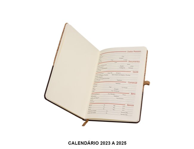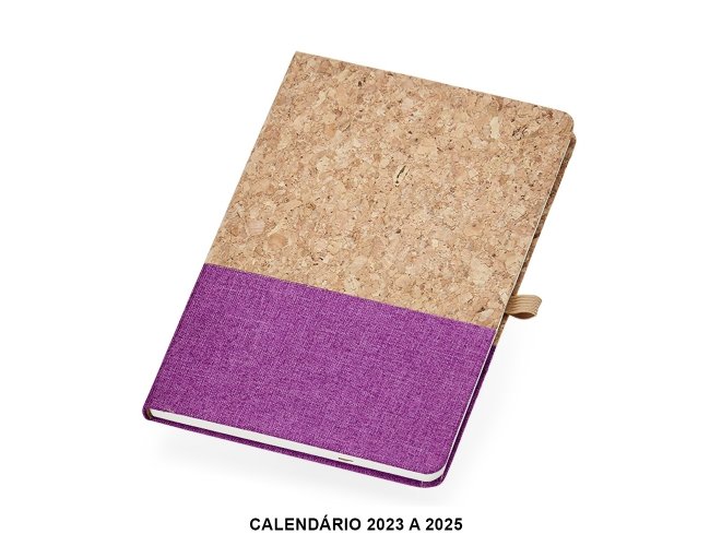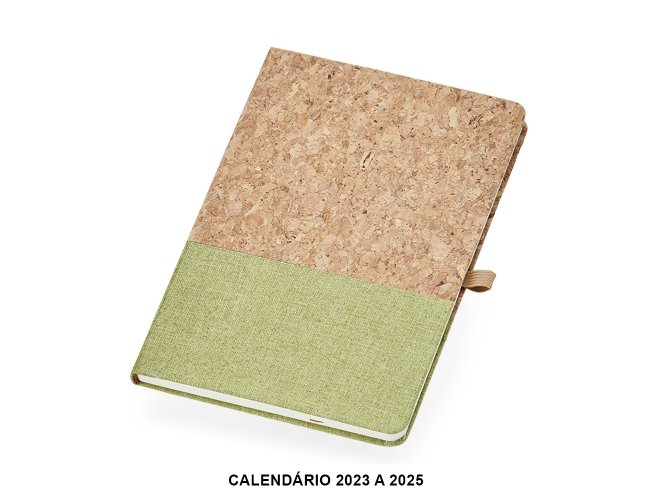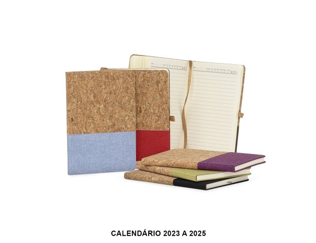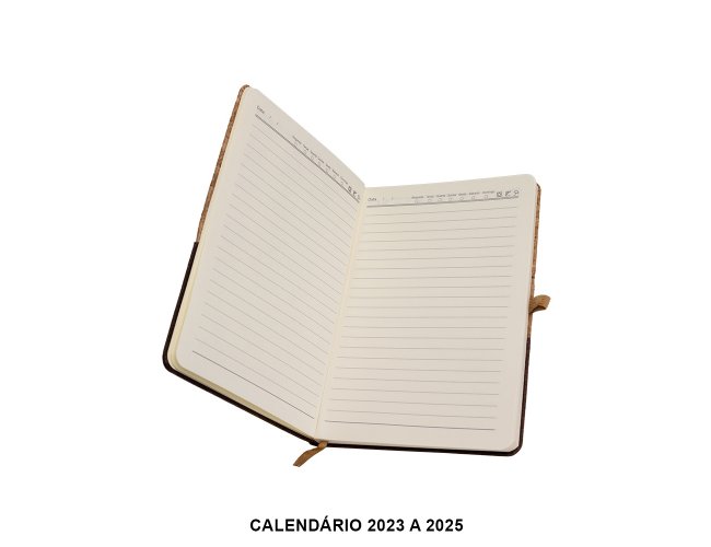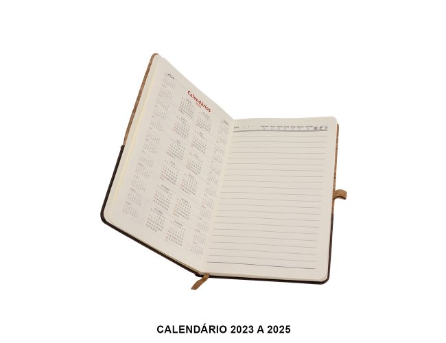 Obs.: Calendário 2023 à 2025. Caderneta A5 de cortiça com detalhe em linho e suporte para caneta, contém marcador de página em cetim, página para dados pessoais, calendário e aproximadamente 93 folhas marfim com pauta.
