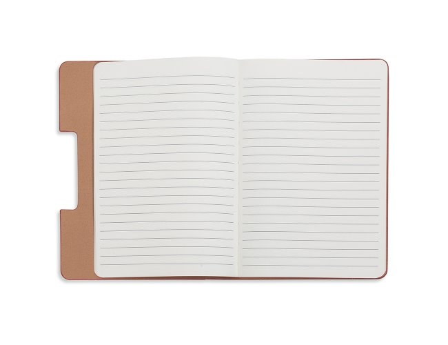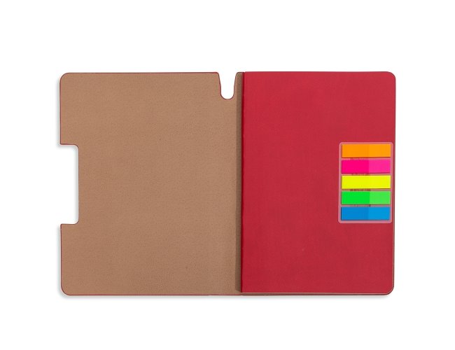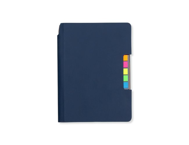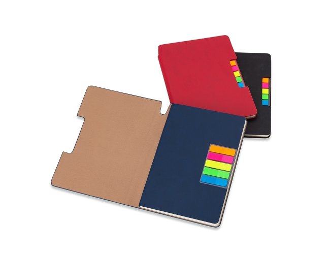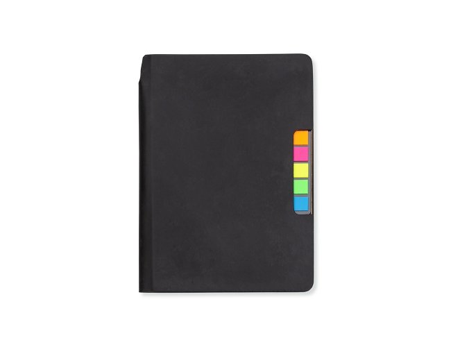 Caderneta produzida em couro sintético com autoadesivos. Capa interna com cinco bloquinhos autoadesivos coloridos com aproximadamente 25 folhas cada e bloco com aproximadamente 80 folhas pardas pautadas.