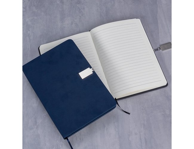 Caderneta emborrachada com fecho metálico imantado. Possui aproximadamente 96 folhas amarelas pautadas e marca página de cetim.