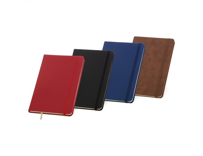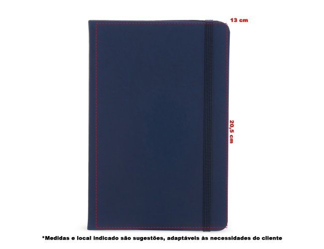 Caderneta em couro sintético emborrachado, possui marca página em cetim e elástico para lacre. Contém aproximadamente 80 folhas marfim pautadas.