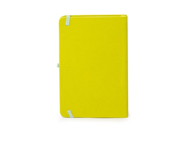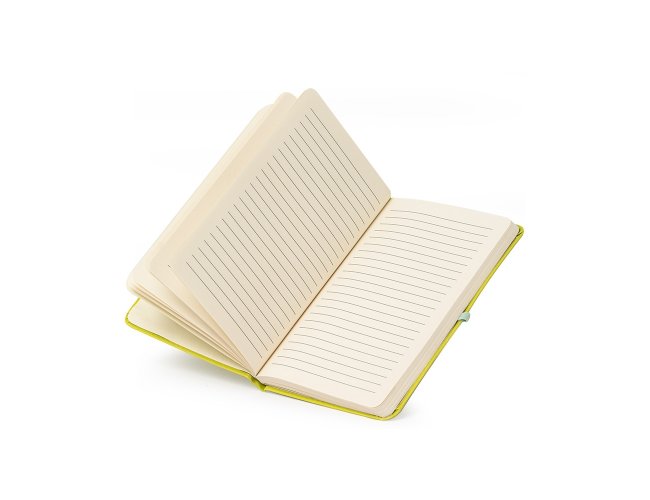 Caderneta em couro sintético com porta caneta, marcador de página em cetim e fita elástica para lacre. Contém aproximadamente 80 folhas pardas com pauta.