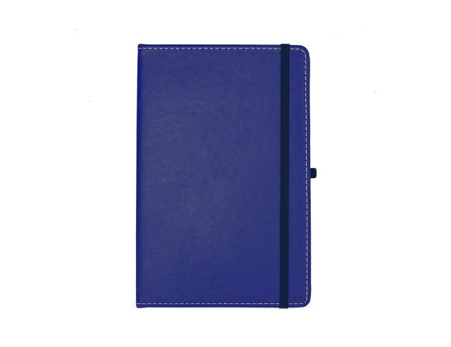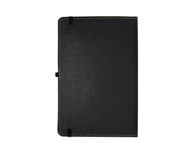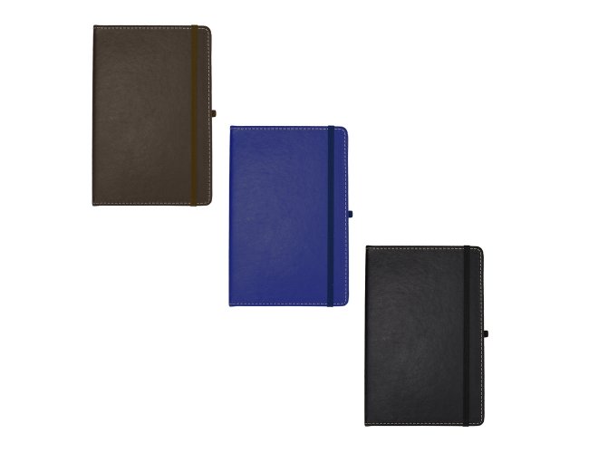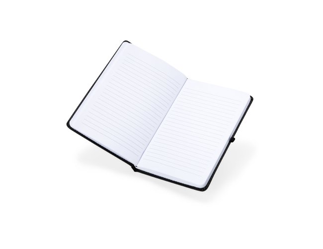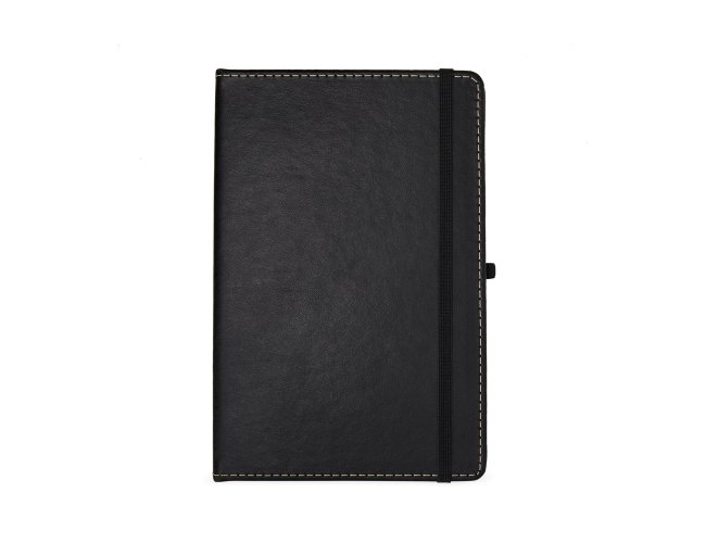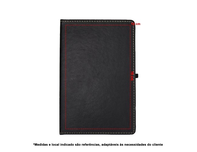 Caderneta em couro sintético com porta caneta, marca página em cetim e elástico para fecho. Contém aproximadamente 80 folhas brancas com pauta.