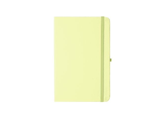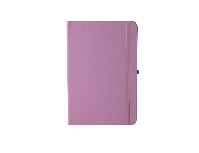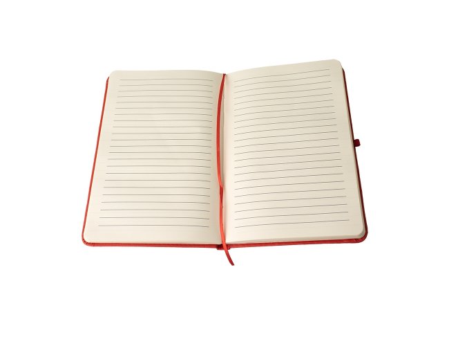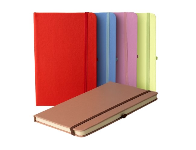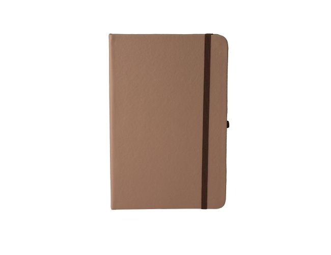Caderneta em couro sintético com porta caneta, marcador de página em cetim e fita elástica para lacre. Contém aproximadamente 80 folhas pardas com pauta.
