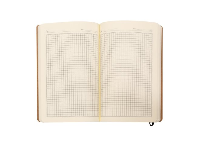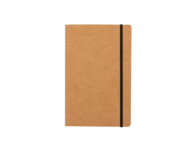 Caderneta com páginas quadriculadas, produzido em material kraft com frente e verso liso e fita elástica para fechar. Contém aproximadamente 80 folhas marfim quadriculadas.