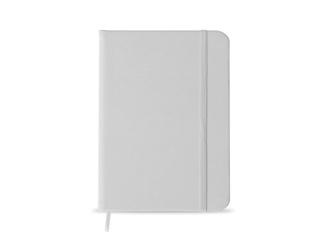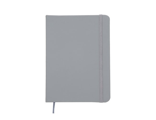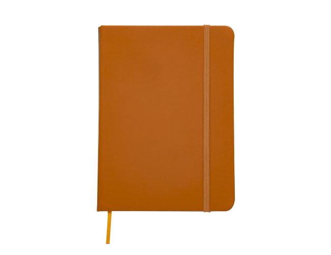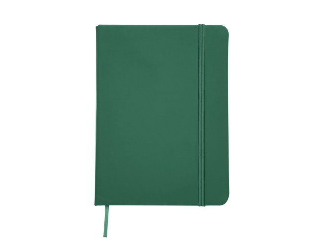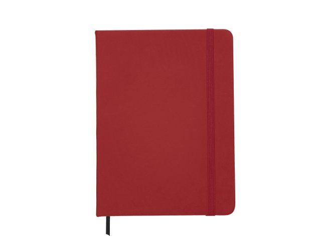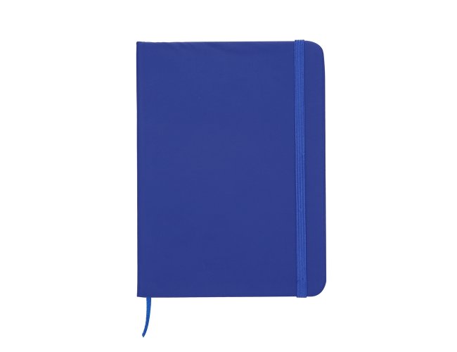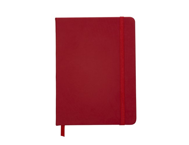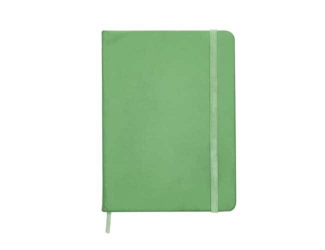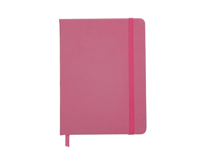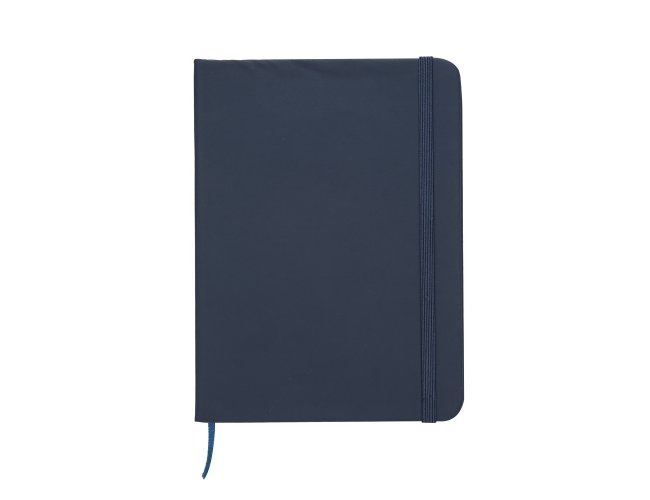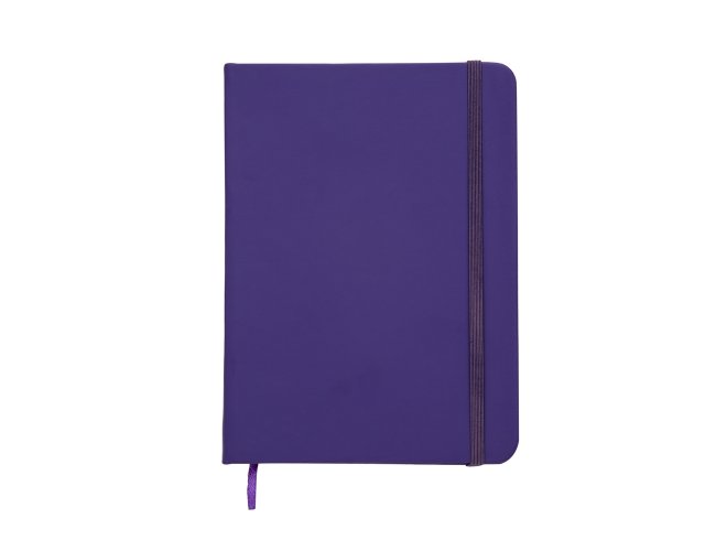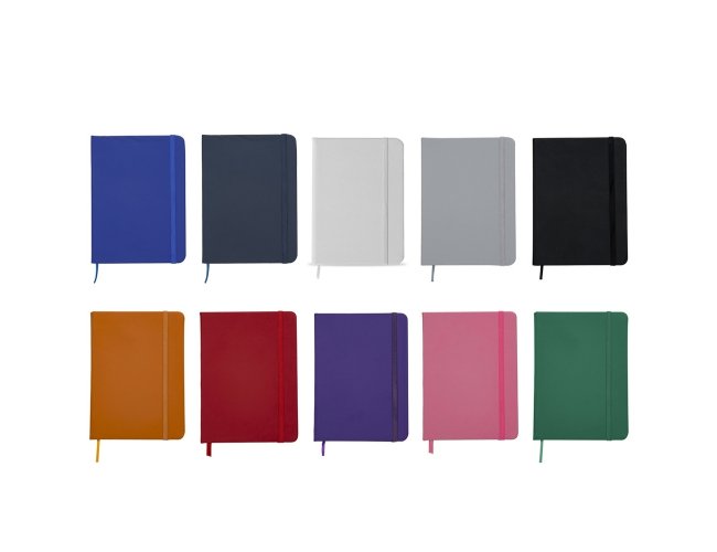 Caderneta emborrachada com pauta, elástico para lacre e marcador de página em cetim.