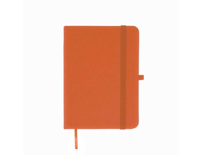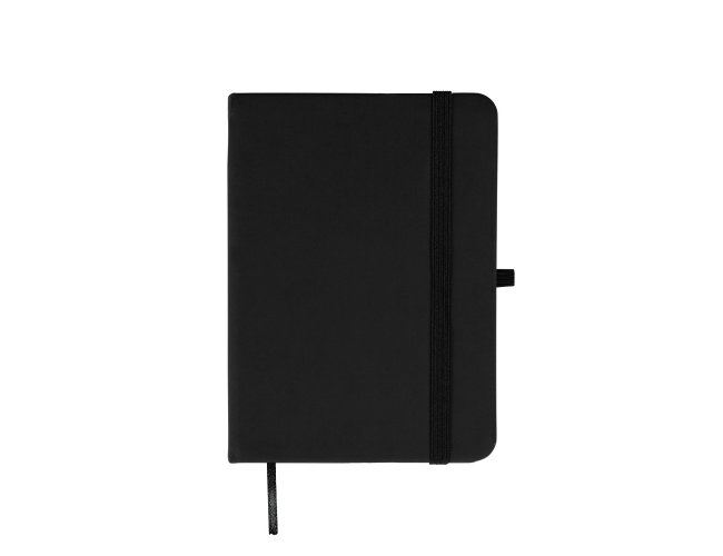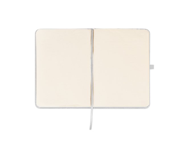 Caderneta emborrachada com elástico para lacre, marcador de página em cetim e porta caneta, contém aproximadamente 84 folhas marfim sem pauta.