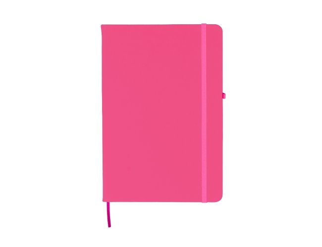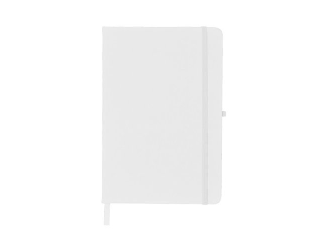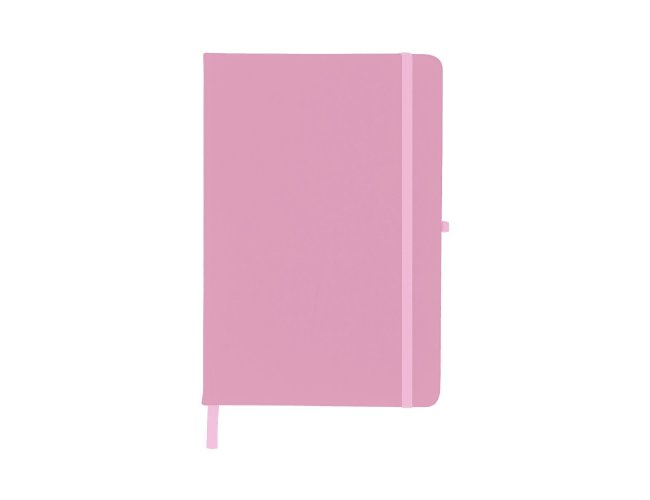 Caderneta emborrachada com porta caneta elástico em nylon, marcador de página em cetim e fita elástica de nylon para fechar. Contém aproximadamente 80 folhas pardas pautadas.