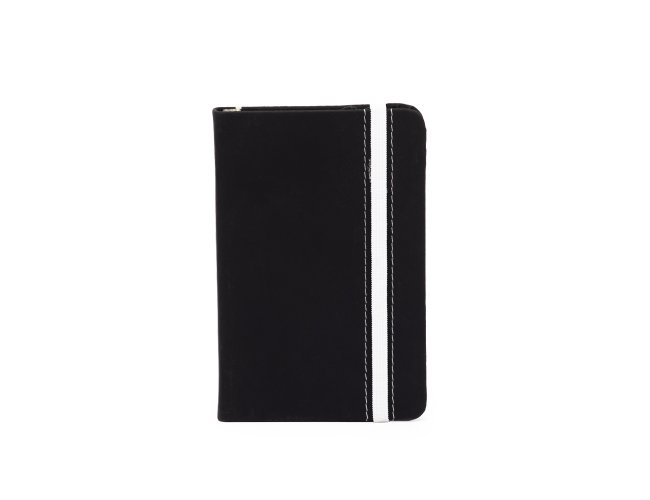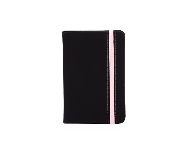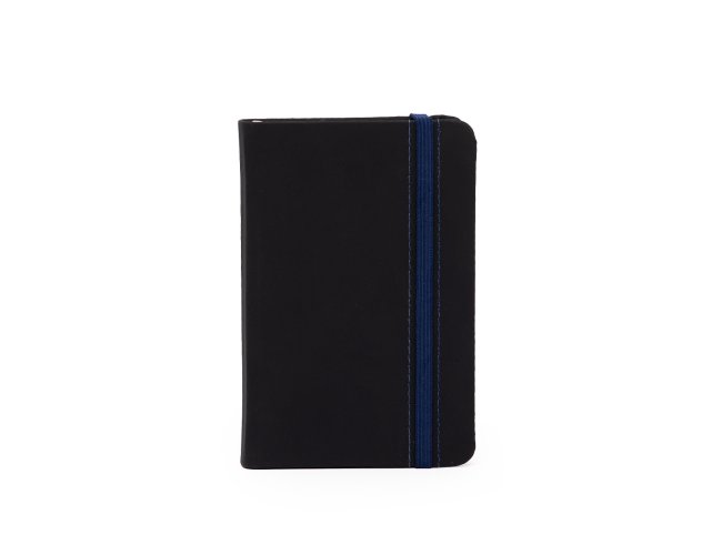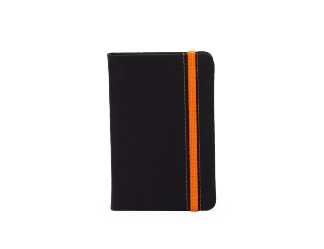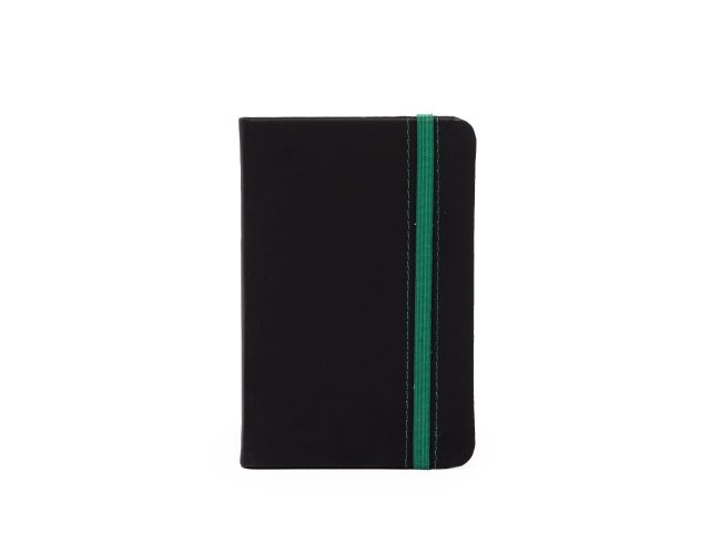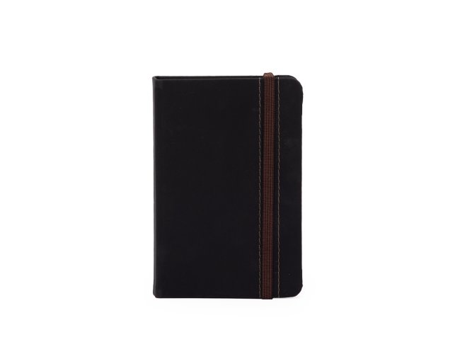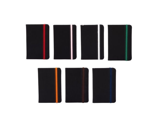 Caderneta emborrachada com marcador de página em cetim e fita elástica de nylon para fechar. Contém aproximadamente 78 folhas marfim sem pautas.