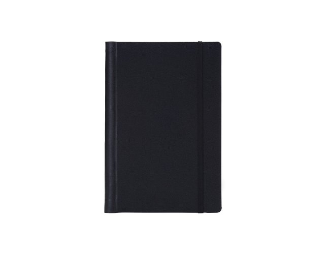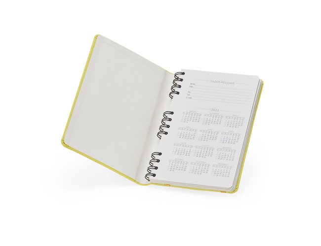 Caderneta emborrachada com wire-o, elástico para lacre e marcador de página em cetim. Possui páginas para dados pessoais, calendário de 2024 à 2026, página de contatos e aproximadamente 100 páginas em marfim com pauta.