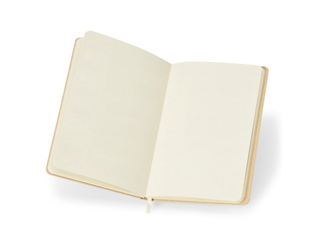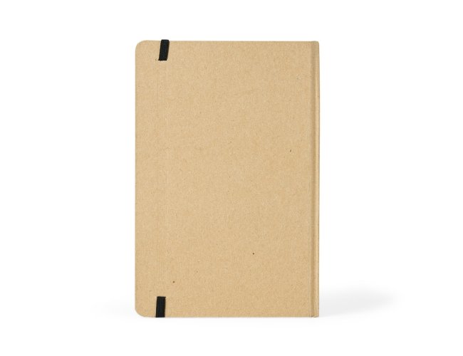 Caderneta de kraft com marca página em cetim e elástico para lacre. Contém aproximadamente 80 folhas marfim sem pauta.