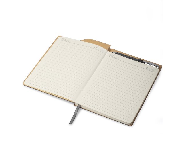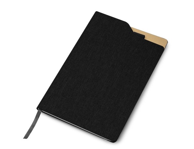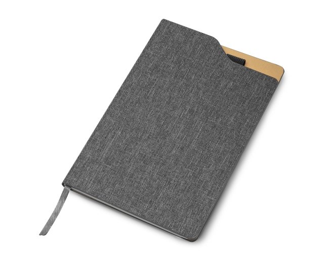 Caderneta com capa dura em RPET (PET Reciclado), com porta caneta e marca página em cetim. Contém aproximadamente 80 folhas com pauta.