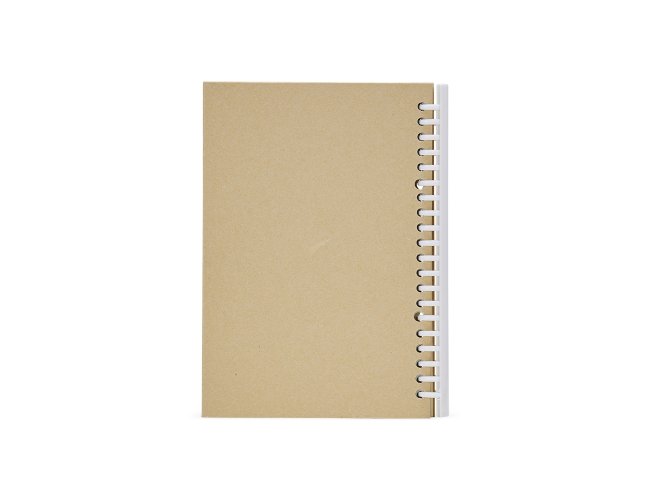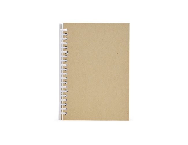 Caderno A5 com capa dura em kraft e espiral removível, contém aproximadamente 87 folhas marfim com pauta.