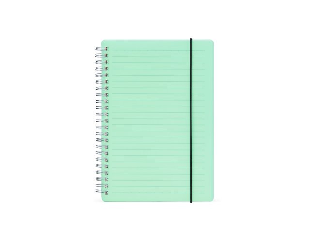 Caderno A5 com capa plástica e elástico para lacre, contém aproximadamente 80 folhas marfim com pauta.
