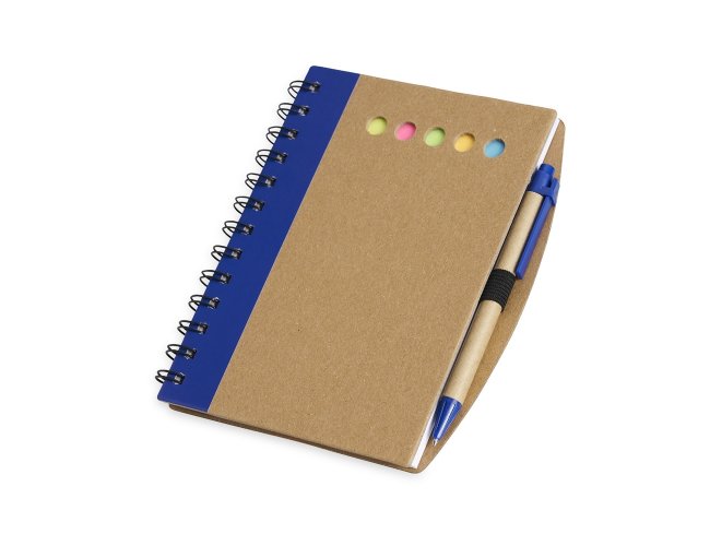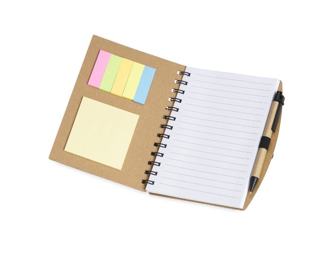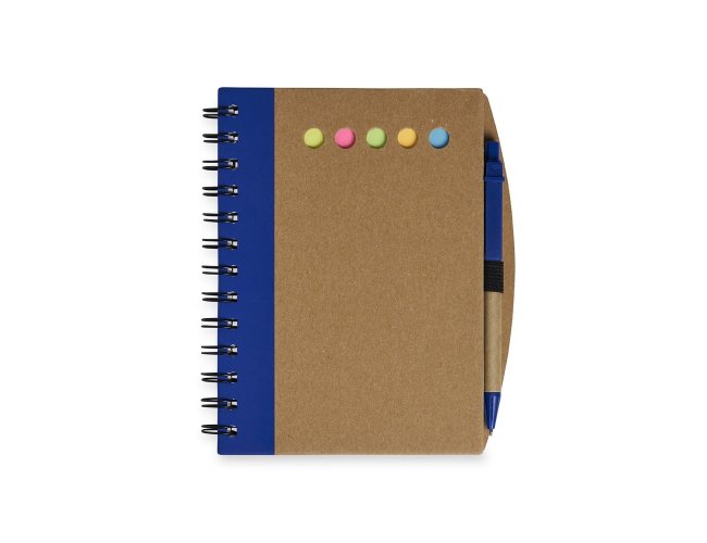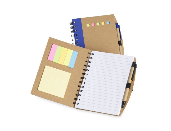 Caderno em papelão rígido com caneta. Possui 6 blocos de autoadesivos com aproximadamente 21 folhas e bloco pautado com aproximadamente 70 folhas. Caneta de papelão com detalhes plástico, carga esferográfica azul e acionamento por clique.