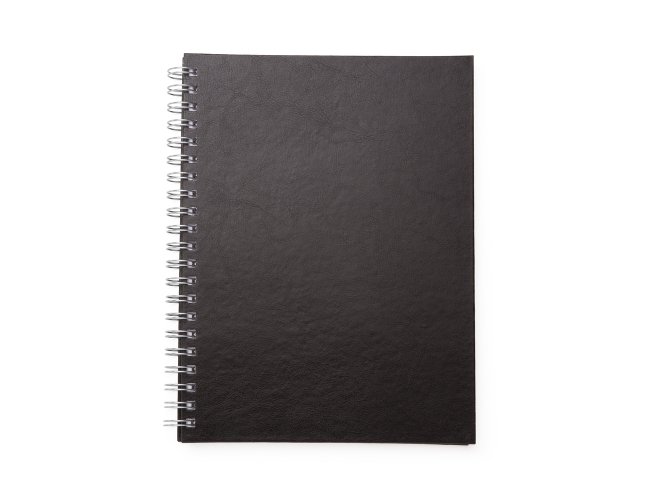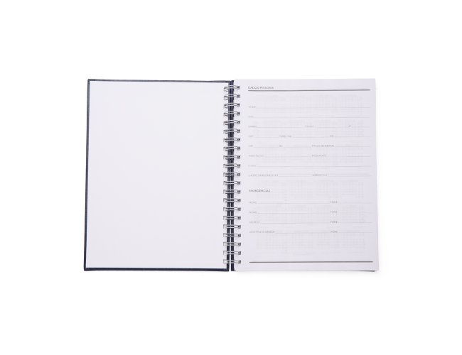 Caderno com capa de couro sintético texturizado e espiral prata metálico. Possui aproximadamente 100 folhas brancas pautadas e páginas para: dados pessoais, calendário de 2023 à 2026 e planejamento.