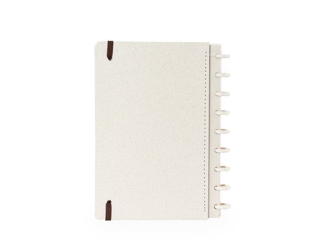 Caderno de capa dura em papel reciclado, com fechamento em elástico e encadernação em discos de fibra de arroz, que permitem adicionar ou retirar folhas compatíveis. Possui páginas dedicadas para dados pessoais, calendários de 2025 e 2026 e um manual para troca e retirada de folhas. Possui cerca de 80 folhas em papel reciclado pautadas.