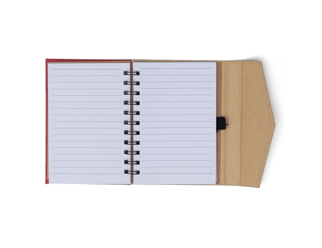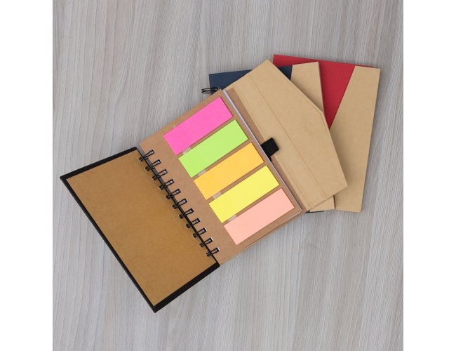 Caderno ecológico com autoadesivos e suporte para caneta. Caderneta com capa colorida e abertura lateral imantada, primeira folha com cinco blocos autoadesivos coloridos com aproximadamente 25 folhas e aproximadamente 68 folhas brancas pautadas. Ultima página kraft conta com suporte para caneta em nylon(não acompanha caneta).