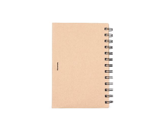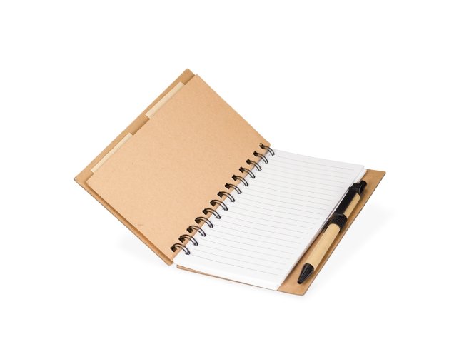 Caderno de capa dura em kraft com porta-canetas elástico, encadernação Wire-O e dois bolsos internos. Contém cerca de 70 folhas pautadas brancas, além de um bloco com aproximadamente 20 folhas amarelas autoadesivas. Inclui ainda seis blocos de marcadores de página coloridos autoadesivos, com cerca de 20 unidades cada. Acompanha caneta esferográfica com carga azul de 1.0mm, acionamento por clique, corpo em papelão e demais componentes feitos em plástico.