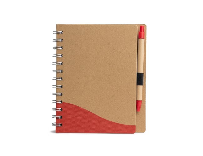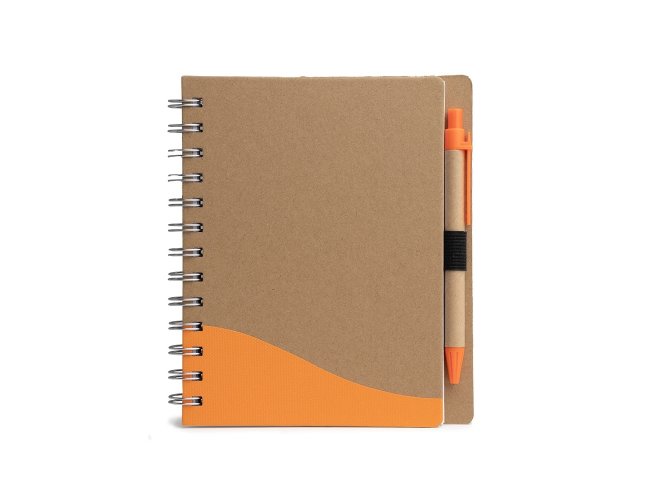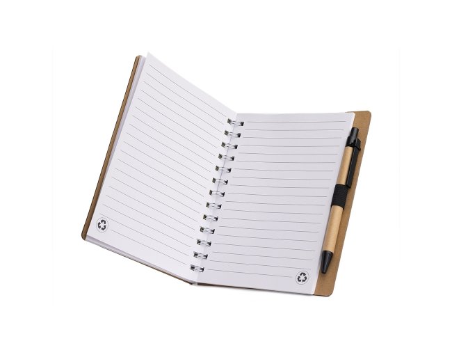 Caderno ecológico com caneta, capa produzida em papelão com detalhe texturizado e verso liso. Contém miolo com aproximadamente 70 folhas pautadas, suporte de nylon e acompanha caneta de papelão com clip e ponteira de plástico, carga esferográfica 1.0mm e acionamento por clique.