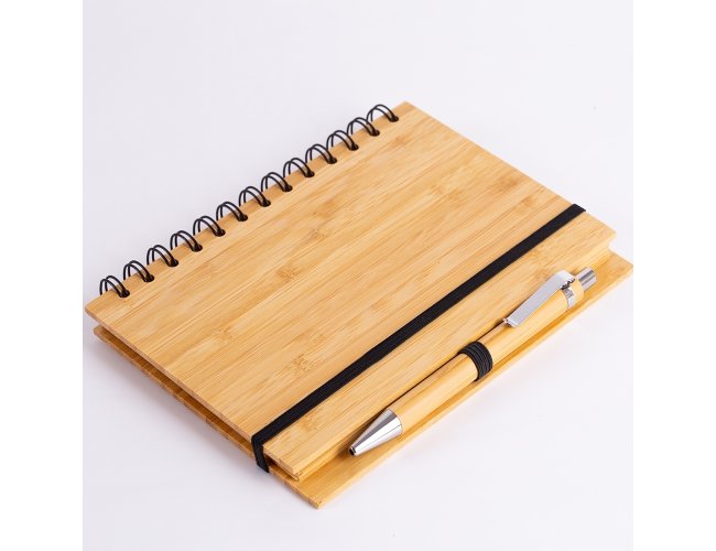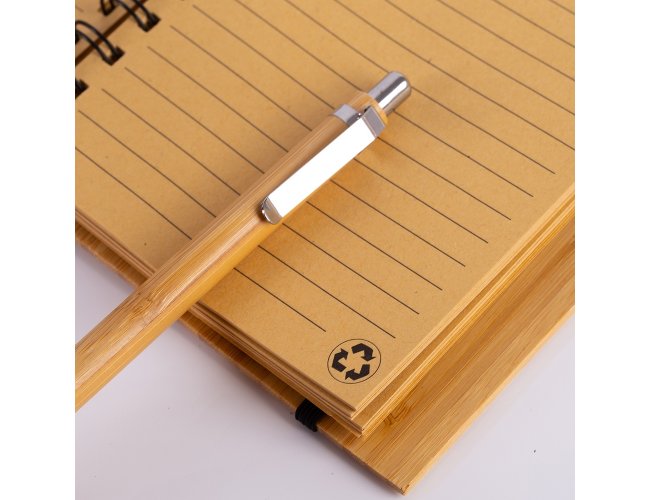 Caderno ecológico com caneta. Capa de bambu. Possui aproximadamente 70 folhas beges pautadas com logo reciclado na lateral inferior. Acompanha suporte elástico de nylon com uma caneta de bambu com detalhes em metal.