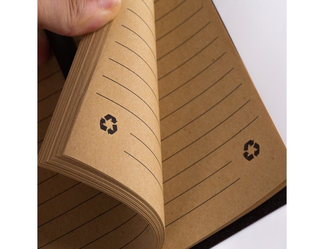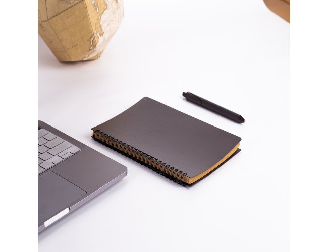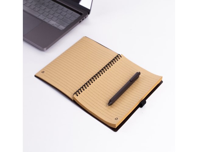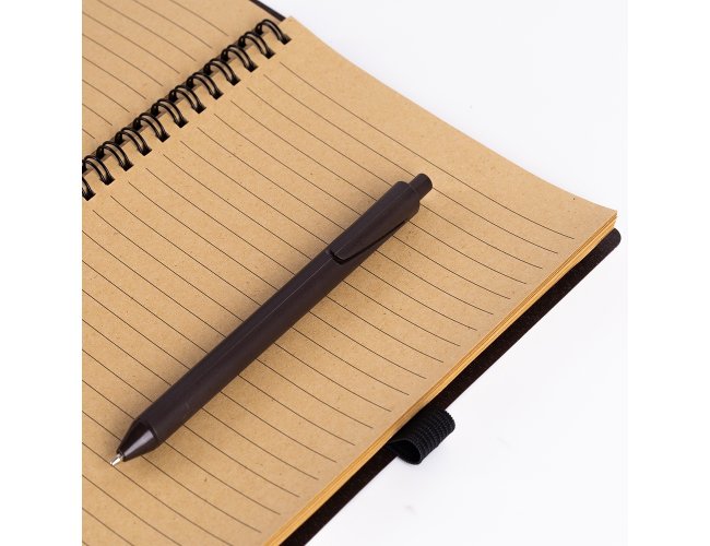 Caderno ecológico com caneta plástica: bloco de anotações com elástico e suporte para caneta, produzido com grãos de café e polipropileno, aproximadamente 70 folhas com pauta, caneta plástica com acionamento por clique.