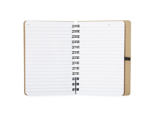 Caderno capa dura em kraft com wire-o e porta caneta. Contém aproximadamente 100 páginas pautadas na cor branca.