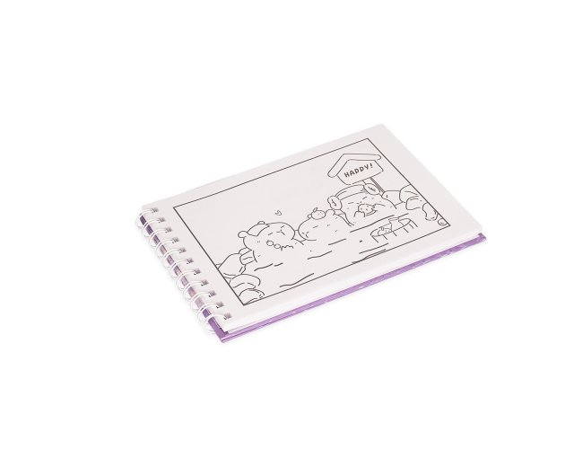 Caderno de colorir de capa dura com laminação holográfica e encadernação Wire-O. Possui aproximadamente 48 folhas com ilustrações de capivaras e outros animais em momentos leves e divertidos. Acompanha uma folha protetora destacável em acetato.