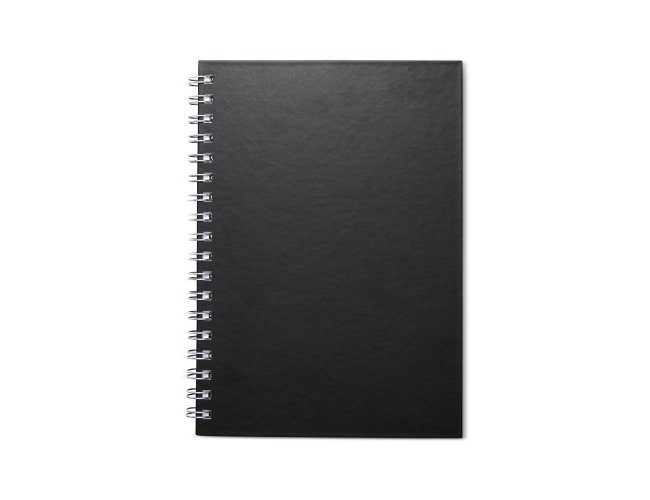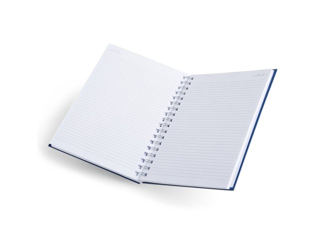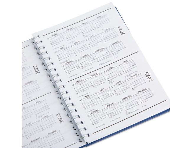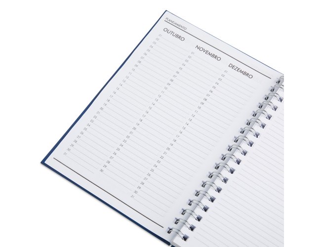 Caderno percalux emborrachado com espiral metálico. Possui aproximadamente 94 folhas brancas pautadas e páginas para: dados pessoais, calendário de 2024 à 2027 e planejamento.