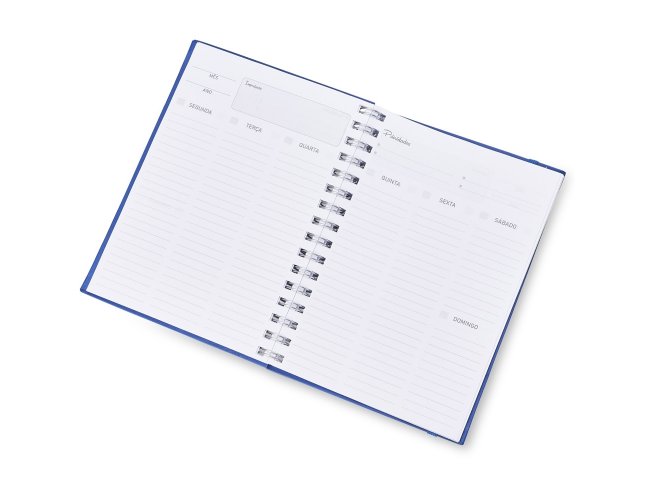 Caderno planner feito em capa cartonada com elástico para lacre. Com aproximadamente 62 folhas, o planner possui página para dados pessoais, calendários 2025 e 2026, planejamento anual, objetivos e metas, controle financeiro e resoluções do ano.