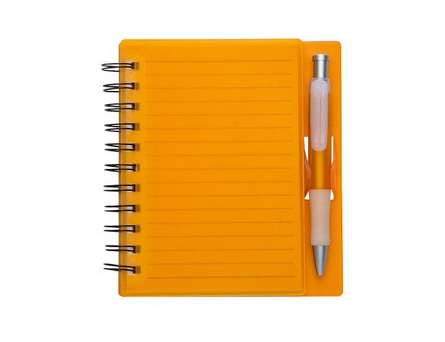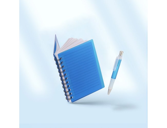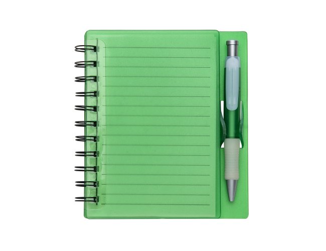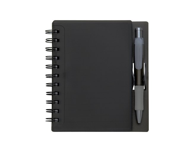 Caderno plástico wire-o com caneta e suporte para encaixe. Caneta plástica com detalhe emborrachado, carga esferográfica na cor azul e acionamento por clique.