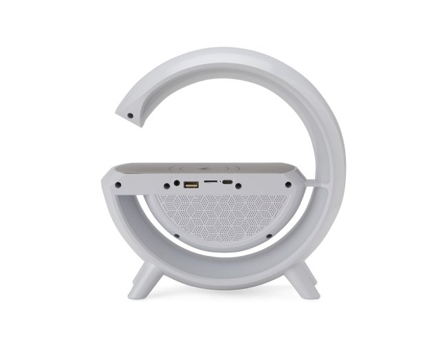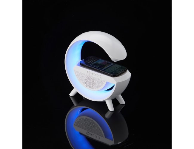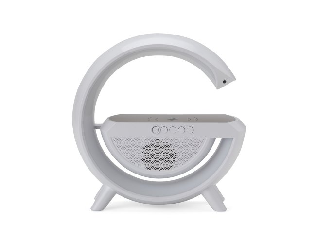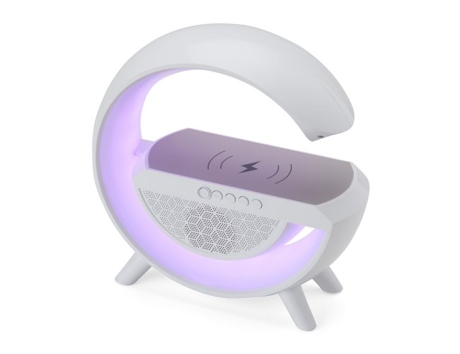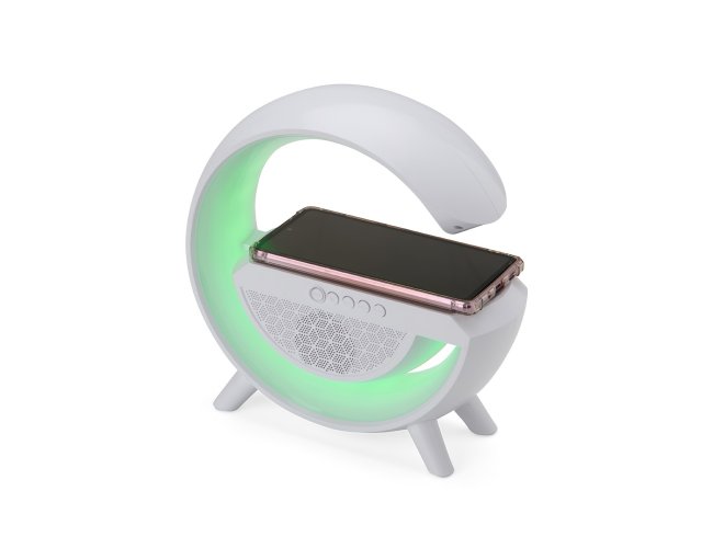 Caixa de som com carregador por indução e luminária. Possui 6 modos de iluminação, opera nos modos bluetooth, rádio FM, auxiliar P2, USB e TF (cartão MicroSD). Para desfrutar do carregamento por indução (sem fio) é fundamental que o celular possua a tecnologia QI, o produto só armazena bateria para funcionamento próprio, para funcionar a indução precisa estar conectado a uma fonte de energia.