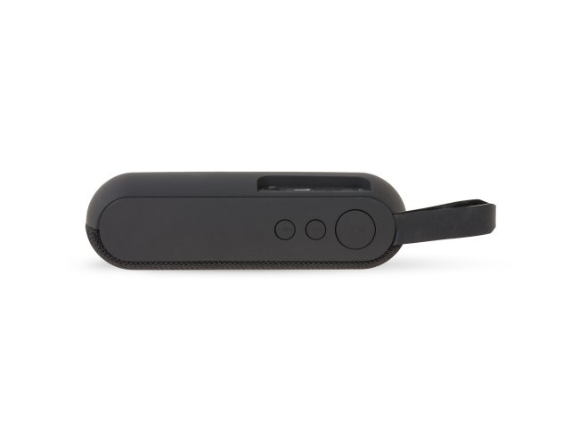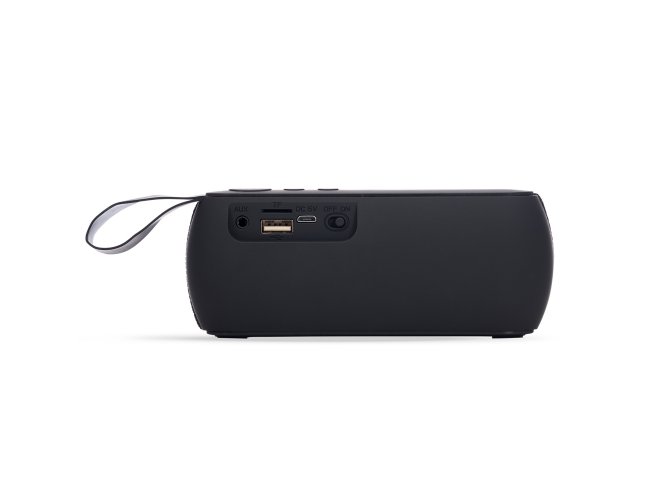 Caixa de Som Multimídia. Produzida em material emborrachado com alça lateral, tela de proteção dos falantes em tecido, parte inferior com borrachas anti-deslizantes. Possui os botões de Play/Pause e Modo; Aumentar e diminuir volume/avançar e retroceder faixas; Entrada auxiliar P2; Entrada TF (cartão MicroSD); Entrada USB; Microfone; Entrada DC 5V e botão para ligar e desligar. Acompanha cabo USB.