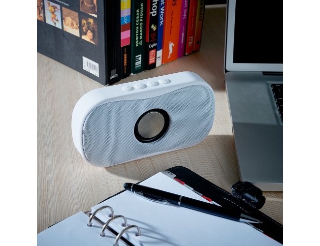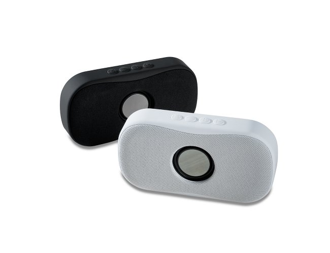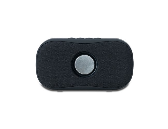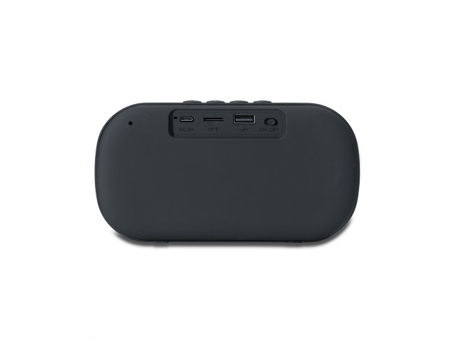 Caixa de som plástica multimídia com efeito visual, são geradas vibrações no alto-falante ao reproduzir músicas com batidas graves. Operante nos modos: bluetooth, rádio FM, cartão microSD e atendimento de chamadas. Contém plaquinha metálica fixa na área frontal e base com borrachas antiderrapantes. Acompanha cabo USB.