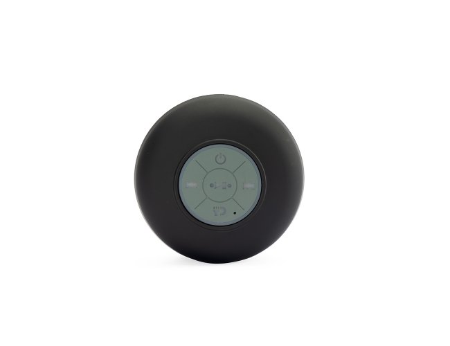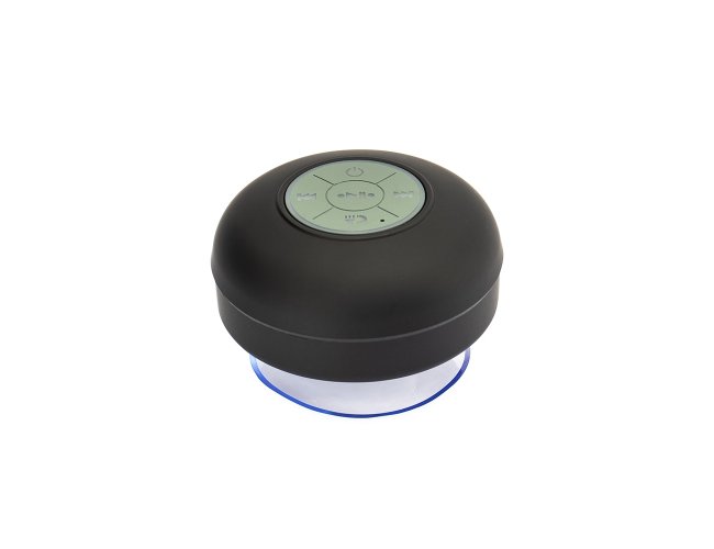 Caixa de som multimídia em plástico com textura emborrachada resistente a respingos dágua. Possui conexão Bluetooth e painel com botões de controle de reprodução, além de tecla dedicada ao atendimento de chamadas. Conta ainda com ventosa removível para fixação em superfícies lisas e entrada USB-C para recarga. Acompanha cabo USB-C.