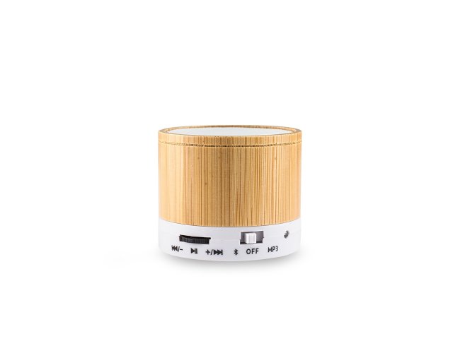 Caixa de som multimídia feita em plástico com acabamento em bambu. Possui alto-falante superior e painel multifunções na lateral inferior, com entrada para cartão MicroSD e porta Micro USB para recarga. Reproduz arquivos MP3 via cartão de memória e sintoniza rádio FM. Acompanha cabo Micro USB.