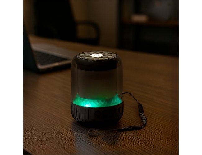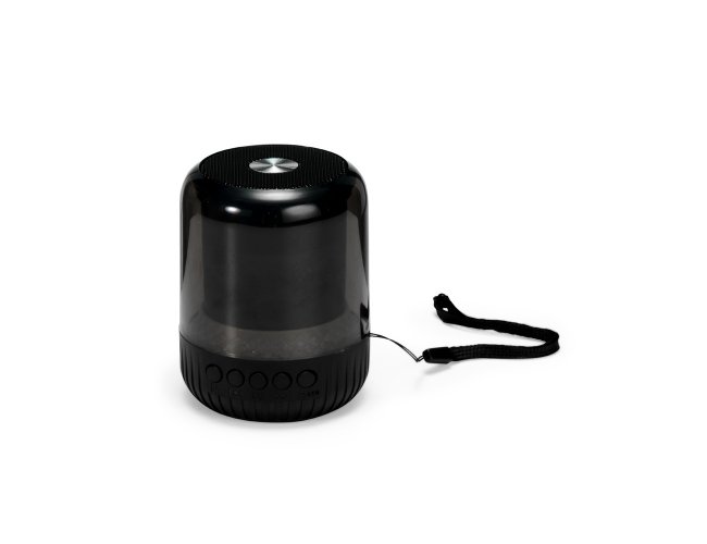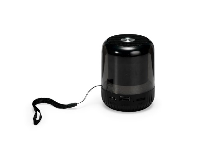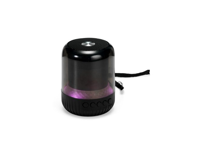 Caixa de som multimídia sem fio, com estrutura cilíndrica em plástico e metal, iluminação colorida em LED e base antiderrapante. Oferece conexão Bluetooth, rádio FM, painel lateral de botões e porta USB-C para carregamento. Dispõe ainda de porta USB-A e slot para cartão MicroSD, permitindo reprodução de músicas em MP3. Acompanha cabo USB-C e alça de nylon para transporte.