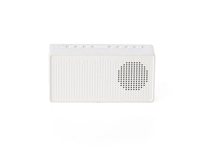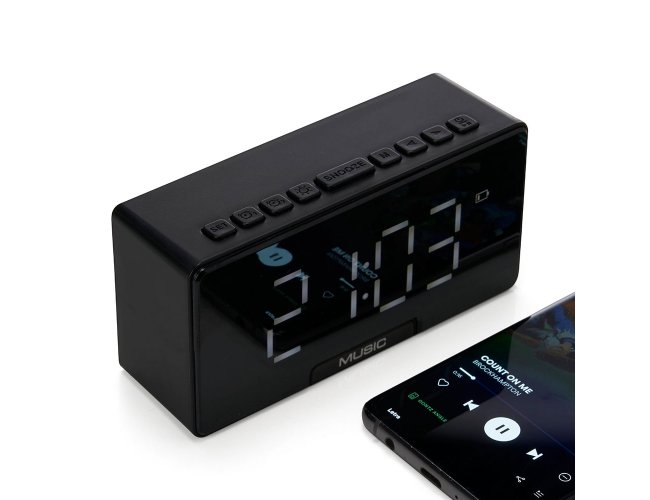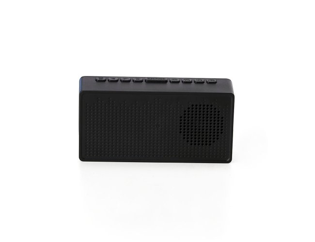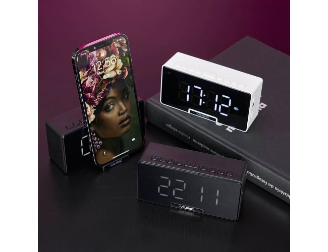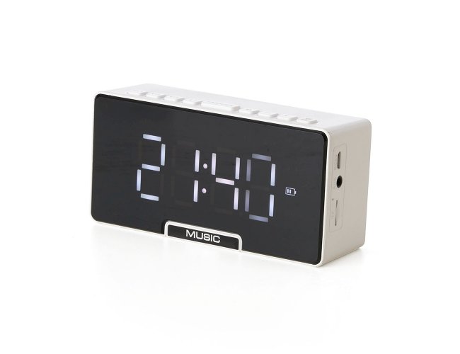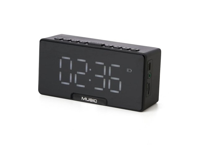 Caixa de som multimídia com relógio despertador e suporte para celular. Produzida em plástico e com borrachas antiderrapantes na área inferior, a caixa de som tem a área frontal com display de LED, além de um compartimento com suporte para celular ? uma espécie de ?gaveta? aonde é exibido (MUSIC), basta puxá-la ter acesso ao compartimento. A caixa de som executa nos modos bluetooth, cartão TF-microSD e entrada auxiliar P2. Acompanha cabo USB e manual em inglês.