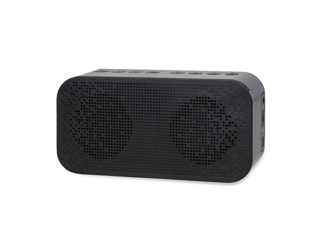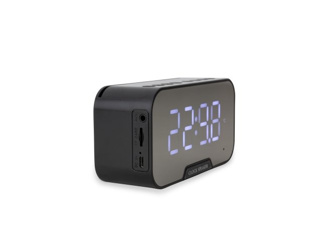 Caixa de som multimídia com relógio despertador e suporte para celular. Produzida em plástico e com borrachas antiderrapantes na área inferior, a caixa de som tem a área frontal espelhada e display de LED, além de um compartimento com suporte para celular ? uma espécie de ?gaveta? aonde é exibido (CLOCK SPEAKER), basta puxá-la ter acesso ao compartimento. A caixa de som executa nos modos bluetooth, rádio FM, cartão TF-microSD (até 16GB) e entrada auxiliar P2. Acompanha cabo USB e manual em inglês.