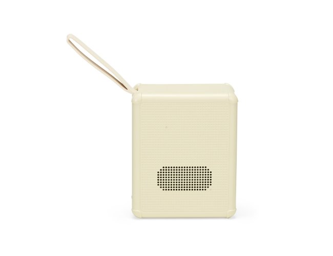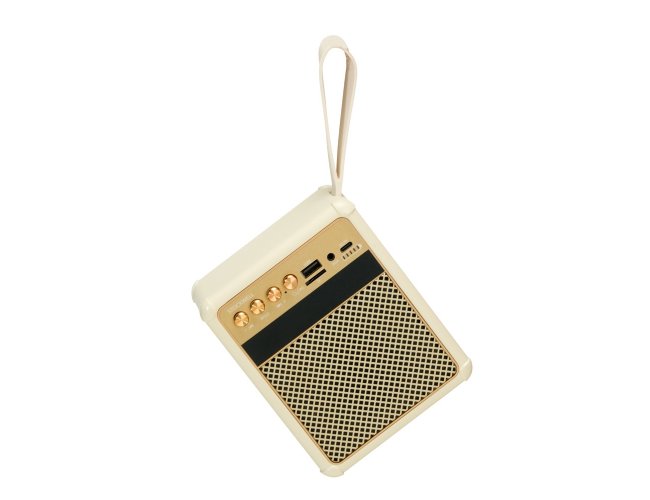 Caixa de som multimídia Bluetooth em plástico e metal, com design inspirado em amplificadores de guitarra, alça de mão e base em silicone. Conta com bateria de até 20 horas de duração, conexão Bluetooth, rádio FM, painel frontal com botões e indicador de bateria, além de porta USB-C para carregamento. Dispõe ainda de porta USB-A e slot para cartão MicroSD, permitindo reprodução de músicas em MP3. Acompanha cabo USB-C.