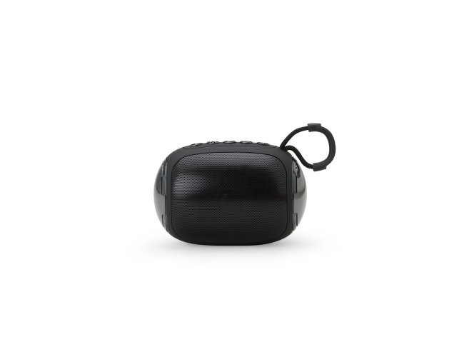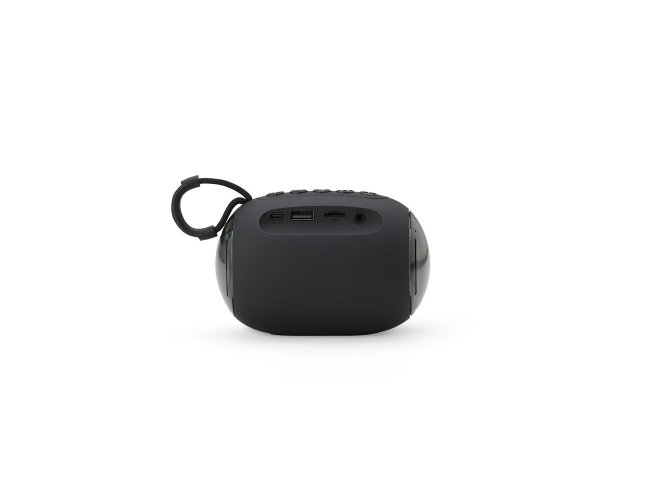 Caixa de som Bluetooth com conectividade TWS, que permite sincronizar duas caixas de som em uma, aumentando a potência sonora. Possui iluminação RGB que se ajusta conforme a batida da música, entrada para cartão TF (MicroSD), pendrive, DC 5V e entrada auxiliar P2. A base é de silicone antiderrapante. Acompanha cordão de nylon e cabo USB-V8.