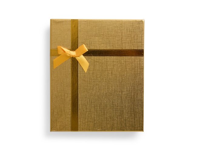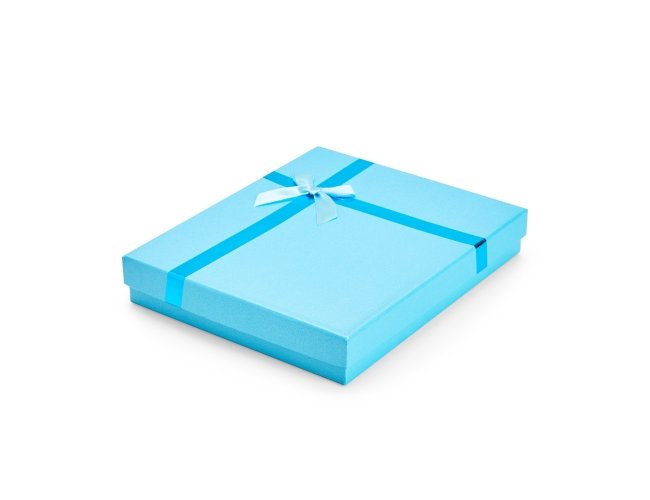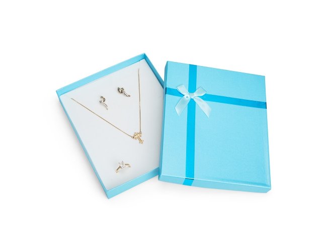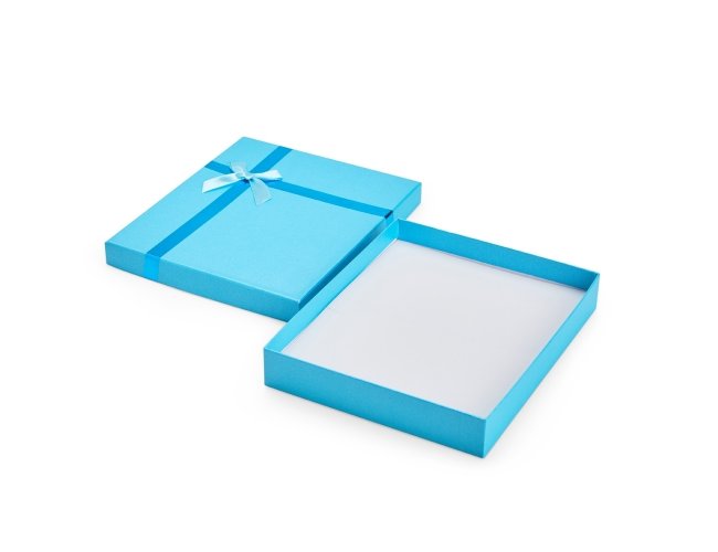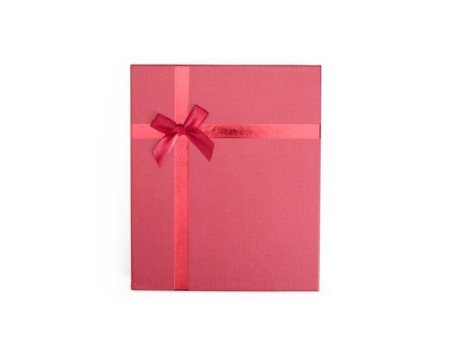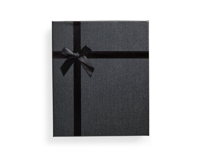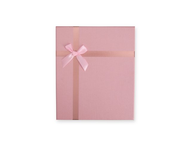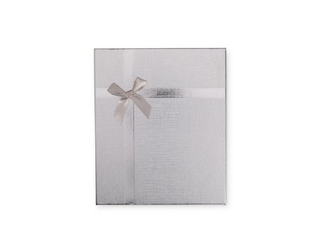 Caixa para presente feita em papelão com acabamento levemente texturizado e laço decorativo colado diretamente na tampa. Conta ainda com berço removível em espuma com ranhuras.