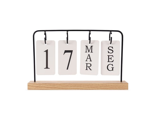 Um calendário permanente de mesa para dar um toque a mais elegante na decoração de mesas, estantes e outros espaços visíveis. Com base em madeira, suporte em metal e cartões em papel cartão, é um item durável e com ajuste manual simples e direto, basta virar o cartão em uma das argolas metálicas para organizar ou reorganizar o calendário da maneira desejada. Acompanha ao todo 16 cartões impressos em frente e verso divididos em: 6 cartões numéricos para marcação dos dias do mês, 6 cartões com nomes dos meses abreviados e outros 4 cartões com a abreviatura dos dias da semana.