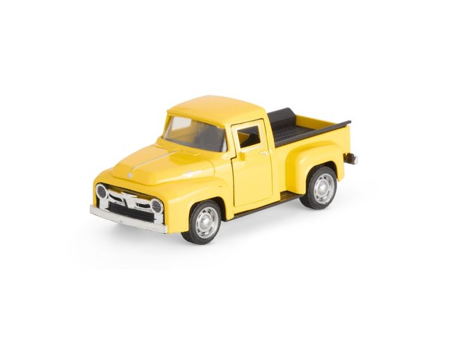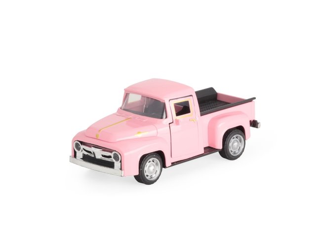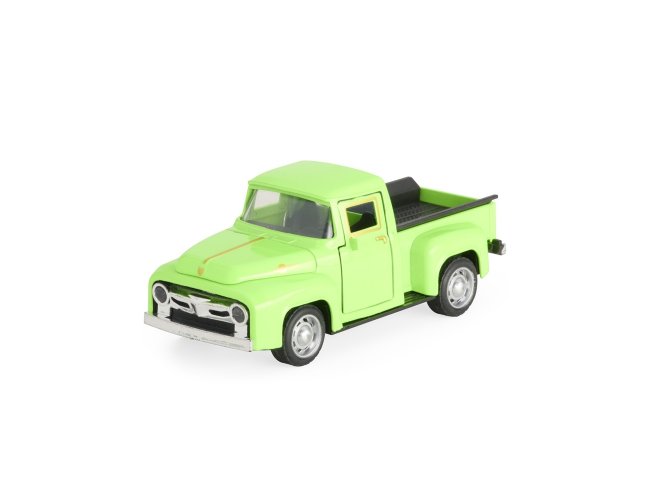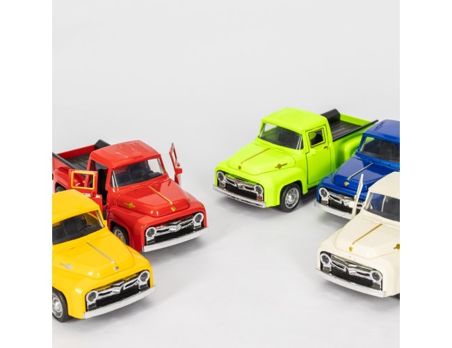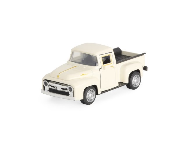 Caminhonete em miniatura com estrutura feita e metal em plástico. Conta com portas e capô com abertura funcional, além de mecanismo de fricção nas rodas traseiras.