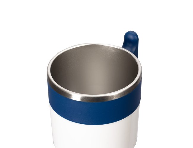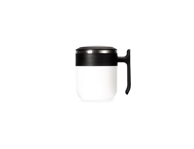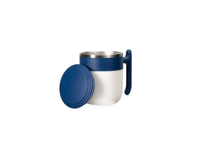 Caneca com design moderno feita em inox e capacidade de até 350ml. Possui revestimento externo, alça e tampa de encaixe em plástico, além da base emborrachada antiderrapante para oferecer mais segurança durante o uso.