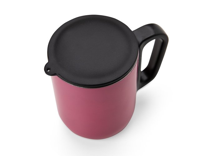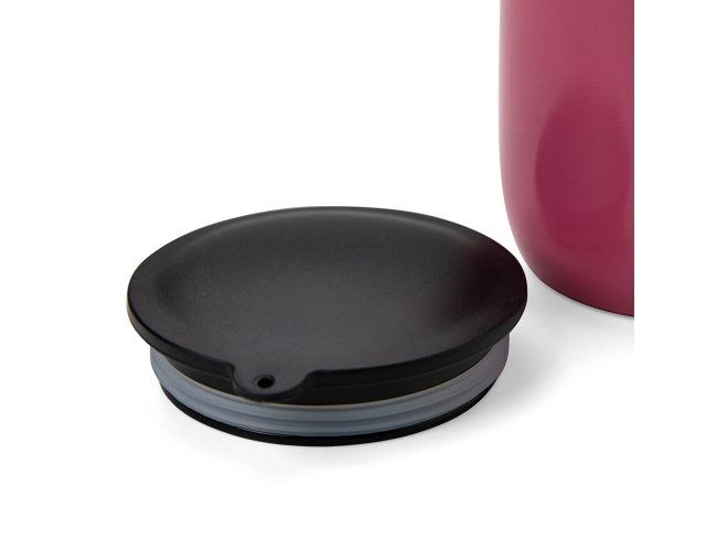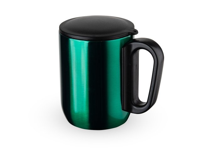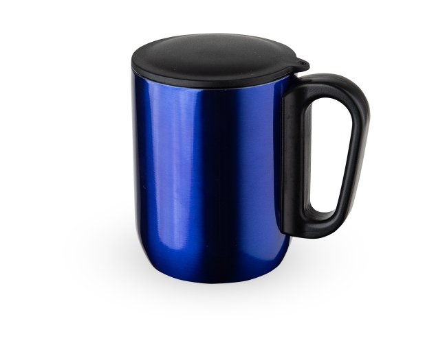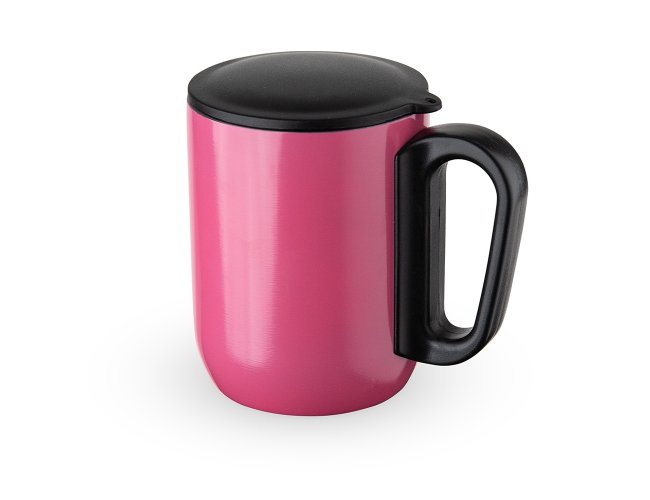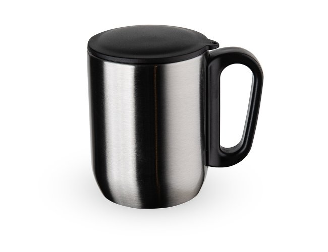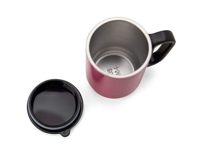 Caneca 230ml parede dupla em Inox, com pegador de plástico, contém tampa plástica para vedação e base com EVA antiderrapante.