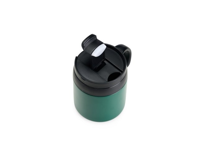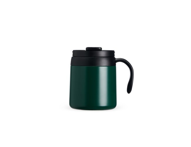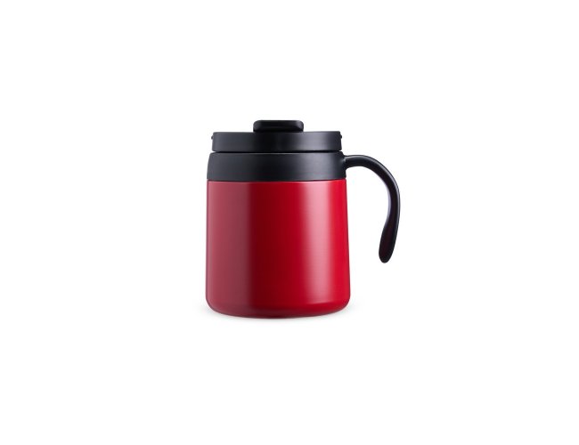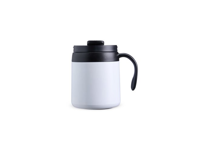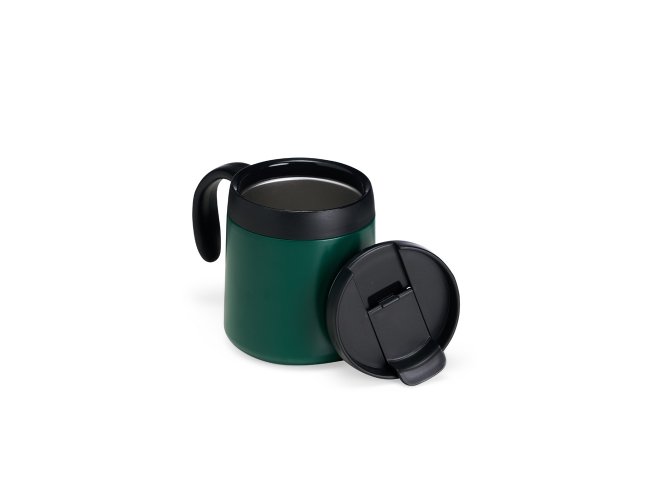 Caneca térmica feita em inox 304 com parede dupla, capacidade de 350ml. Contém tampa de encaixe com acesso para o bocal, alça plástica e base antiderrapante.