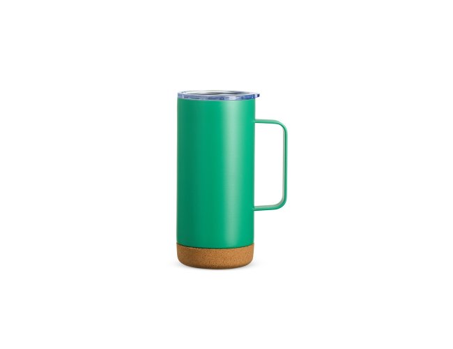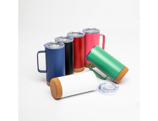 Caneca Térmica de 500ml feita em inox com fundo de cortiça, tampa com bocal e trava de segurança. Um item que alia a elegância da cortiça com o inox.