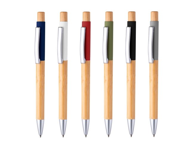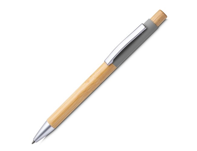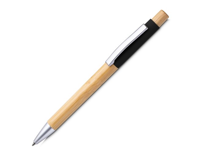 Caneta em alumínio reciclado com detalhe em bambu e acabamento similar à borracha. Possui carga esferográfica azul 1.0 mm e acionamento por clique.