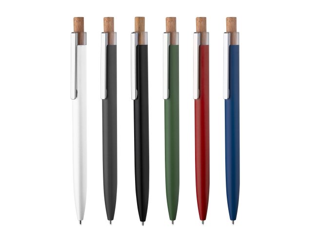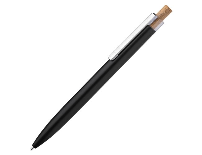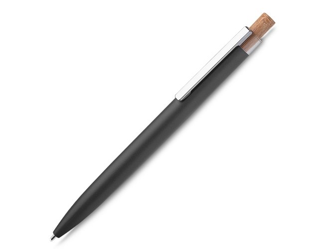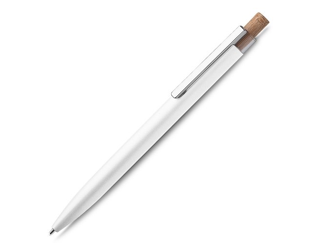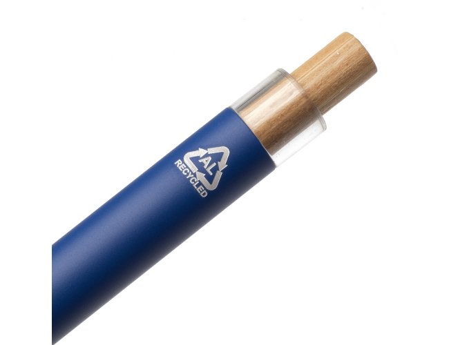 Caneta em alumínio reciclado com carga esferográfica azul 1.0mm e acionamento de clique em bambu.